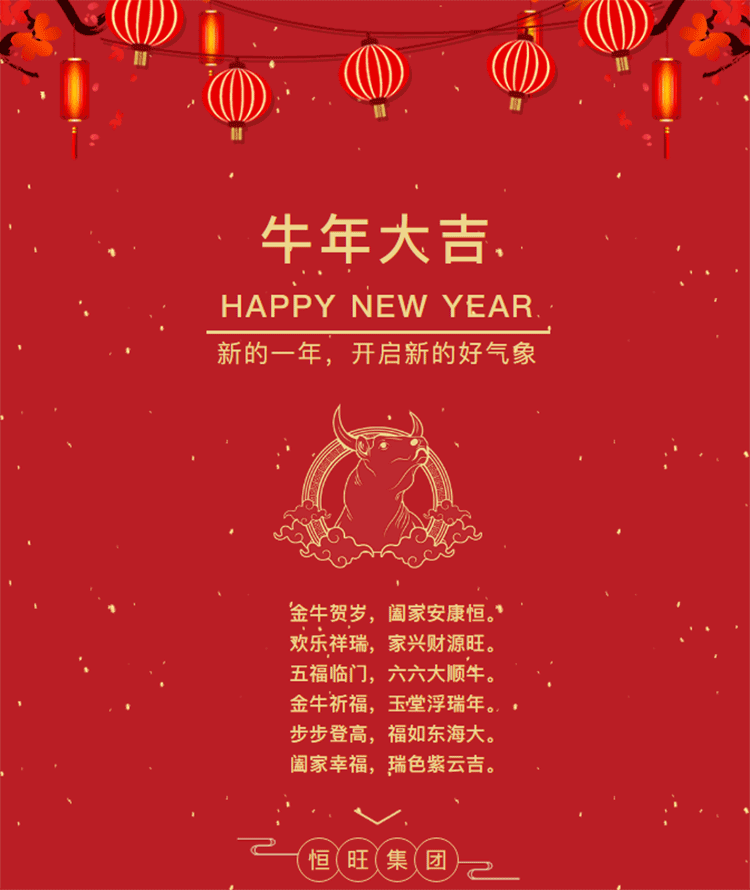 子去丑來(lái)騰錦繡,鼠歸牛到競(jìng)輝煌,恒旺集團(tuán)攜全體員工給您拜年啦!祝您牛年大吉,生意興隆,闔家幸福,萬(wàn)事如意!