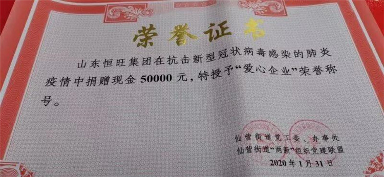 山東恒旺集團(tuán)積極響應(yīng)濟(jì)寧市仙營(yíng)街道的“兩新”抗擊疫情組織,并捐款50000元,被授予“愛(ài)心企業(yè)”榮譽(yù)稱號(hào)。武漢加油!中國(guó)加油!