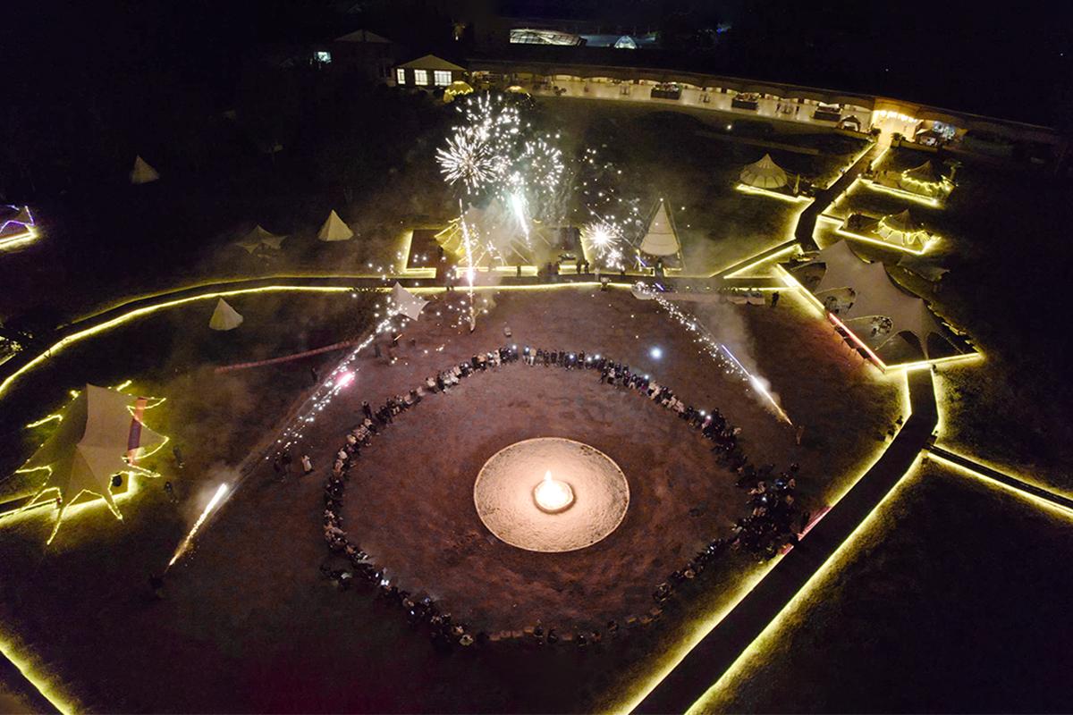 在大草坪上支起架子,點(diǎn)燃篝火,
