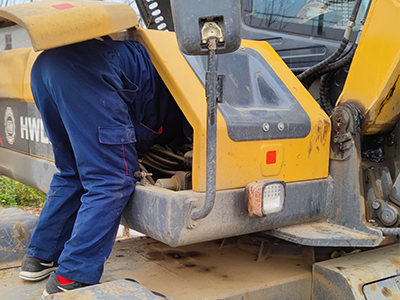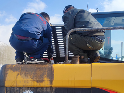 1.檢查大小臂、鏟斗、駕駛室、空濾、配重等各部件情況是否有開(kāi)裂、損壞、松動(dòng)等情況,并及時(shí)更換調(diào)整。